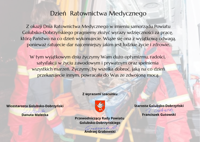 Z okazji Dnia Ratownictwa Medycznego w imieniu samorządu Powiatu Golubsko-Dobrzyńskiego pragniemy złożyć wyrazy wdzięczności za pracę, którą Państwo na co dzień wykonujecie.
