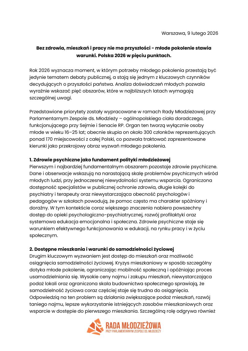 Rada Młodzieżowa przy Parlamentarnym Zespole ds. Młodzieży informuje o przyjętym stanowisku dotyczącym pięciu kluczowych priorytetów młodego pokolenia w Polsce w 2026 roku.