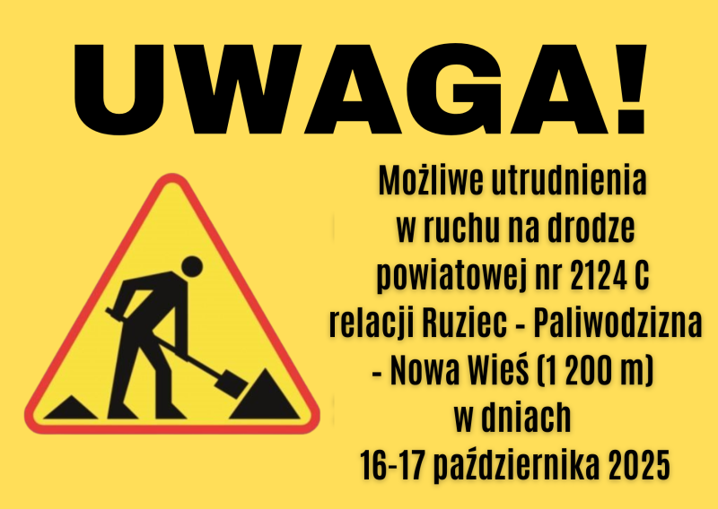 Informujemy, że w związku z rozpoczęciem prac budowlanych polegających na wykonaniu nakładki bitumicznej na drodze powiatowej nr 2124C relacji Ruziec-Paliwodzizna-Nowa Wieś (długość 1200 m) w dniach 16-17 października 2025 r. mogą wystąpić miejscowe utrudnienia w ruchu drogowym.