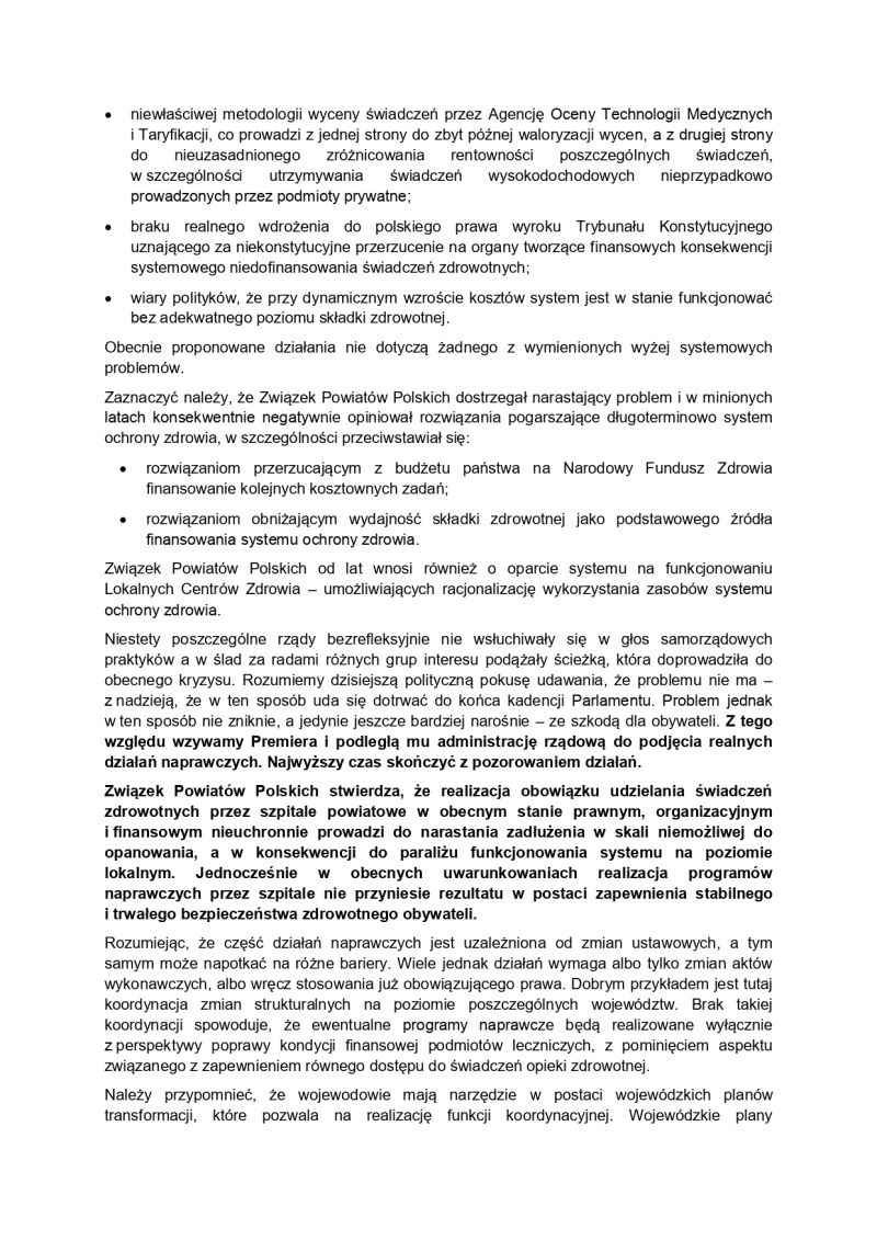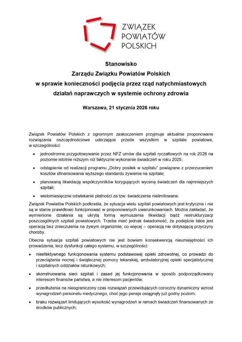 W odpowiedzi na obecną sytuację Zarząd Związku Powiatów Polskich w dniu 21 stycznia br. przyjął stanowisko w sprawie konieczności podjęcia przez rząd natychmiastowych działań naprawczych w systemie ochrony zdrowia. Dokument ten stanowi wyraz wspólnego stanowiska środowiska samorządowego z całego kraju.