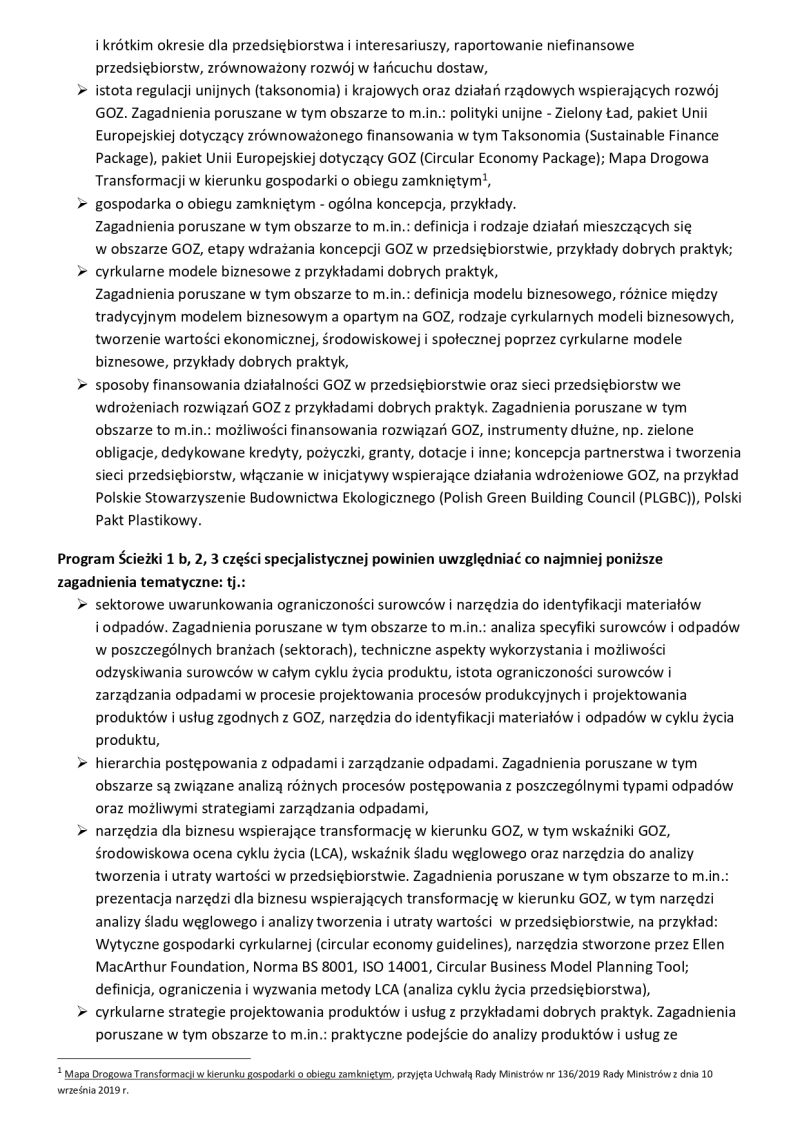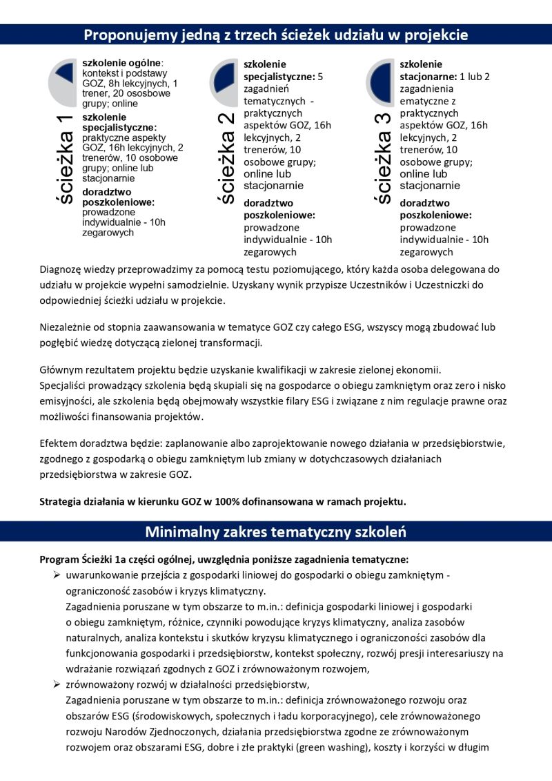 Projekt jest skierowany do przedsiębiorstw. Każde z nich może skorzystać z 8 godzin szkolenia ogólnego (teoria), 16 godzin szkolenia specjalistycznego (teoria z elementami warsztatów) i 10 godzin indywidualnego doradztwa poszkoleniowego (praktyka / warsztaty) z tematyki Gospodarki o Obiegu Zamkniętym. Wynikiem doradztwa będzie plan wdrożeniowy GOZ.
